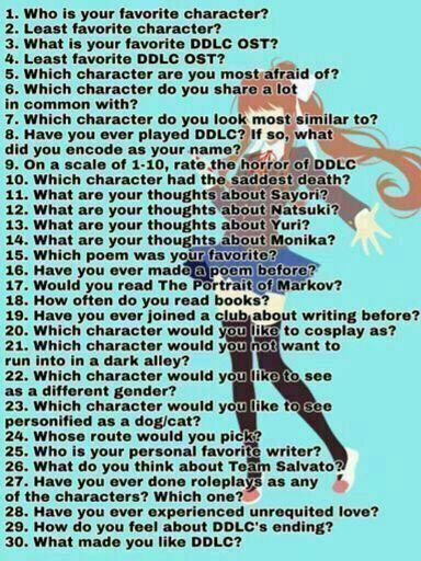 Hey, so I guess I'm just going to do all thirty of these at once because I'm bad with consistency and if I commit to something I often will not do it every day like I had planned. Please feel free to post your own thoughts below after reading my thoughts on the girls and the game. Let's begin. 1. My favorite character is Yuri because her hair is how I'd like it, our personalities are similar in many ways, and other reasons, I'm sure. 2. My least favorite character is Natsuki, even though she is growing on me. She just isn't that interesting, as I'm not a huge tsundere fan. 3. I don't know the names, but probably the song that plays when you're at your house with Yuri. It has a nice, peaceful sound. 4. This is hard... Maybe the poem creation screen? I like them all, I can not decide. 5. Probably Monika, as she is the one who could delete me instantly. 6. Yuri. Konata Izumi and Yuri are like the two halves of my personality, and Yuri is my introspective bookworm-ish side. I have OCD and I get obsessive over small things like she gets obsessive over you and knives. I too like knives. The difference is that I am not as into self-injury and knives as she is... But she would make an amazing partner... Why would I think that when she would kill all of my friends 7. Probably Sayori, as I have shorter hair. 8. Yes! I named myself Harris, what I am called in real life. 9. About a 3 for me, who is unphased by death and gore. Wait... Sayori's suicide was so sad because I loved her personality so much I flinch at the words 'die' or 'suicide' when spoken... Okay, maybe a 6 or 7, actually... 10. Sayori! She was so sweet... I knew it was coming, but when I replay it I avert my eyes and if I accidentally watch I get cold... I swear I am not weak when it comes to death, I just got really attached to her early on. In real life I would take the Sayori route because she was my childhood friend and I am highly empathetic. 11. I just said them... Amazing personality, so sad what happened to her, funny yet interesting poetry. 12. Cute, aggressive, I'm sorry for her father abusing her. 13. Yuri is the best. While most people were horrified at her death (don't judge me), I found it pretty cool and even attractive... She is by far the coolest character and a great waifu. Having someone obsessed with self-harm might be dangerous, but her amazing imagery is astounding. It took me a while to fully understand the imagery in her 'raccoon' poem... She knows that if she cuts herself it will become a habit, but she does anyway... 14. She is cute and energetic, and her (in my mind) sounds study, attractive, and mature. A great friend and possibly waifu for people who don't mind staring into her eyes in a clubroom floating through space eternally... If you're into that kind of thing... 15. Sayori's 'Get out of my head' poem, because I thought at first that she was telling Monika to stop manipulating and changing her, and she was aware that Monika was controlling her gamefile. When I later discovered that it was referring to the player, I still thought (and think today) that it at least somewhat referred to Monika's control, making her a determined and interesting character. I also thought that screaming, "Get out of my head," was what drove her into a panic attack and made her commit suicide, at least partially, as well as the player. 16. Yes! I write quite frequently, and my style is somewhat in between Yuri's and Sayori's: it uses imagery and complex concepts, but in a short and somewhat humorous way. 17. I totally would! I would read it with Yuri in the club room, but finish it without her. I read faster and am less distracted when I am alone. 18. I read books everyday and own more books than the reader has probably owned shirts and pants combined. 19. No, but I would if we had one... And I wasn't already in all the clubs I can be in High School... 20. Yuri. Most people think I look like a boy, so it would be a little awkward, but it would be awesome. 21. Probably... Um... Well, the smart choice would be Yuri, but I feel like I understand her, so she would be okay. Maybe Monika? She has a chilling and all-knowing vibe... 22. None, really. Wait, maybe Natsuki gender-swapped would be cute! He would be the cutest and no one could have him but me... Wait... How can I think that if I don't like her very much as a girl? I guess I think differently of people based on their gender? That's unusual. Maybe I'm just thinking of the shorter hair and masculine personality. 23. Uh... Yuri? I call my black-with-white-stomach-fur cat Yuri (as well as many other nicknames) so her. 24. In real life, Sayori, because it's fair... But Yuri... It would be very hard to decide. Knowing it was all a game, Yuri. 25. Yuri, because of the imagery and expressive words. 26. They are a great game developer/dev team and they should make more games! 27. No, but I would RP Yuri or Monika. 28. This is a though one... Not romantically towards a person, but for a friend and their personality, yes. Has someone experienced unrequited love for me? I think so, but it wasn't Yandere, thankfully... I feel bad for them... 29. It was great! That's really all... 30. This is a though question to answer because there is not one thing that made me like it. The anime style, the girls, Yuri, the yandere, Monika, the horror, the Game Theory episodes, and the cute color palette. Thank you all for reading this list. I hope you'll all add your own answers in replies and have fun with the 6-7 hours of nighttime left to enjoy (lol)! Have a great day/evening!