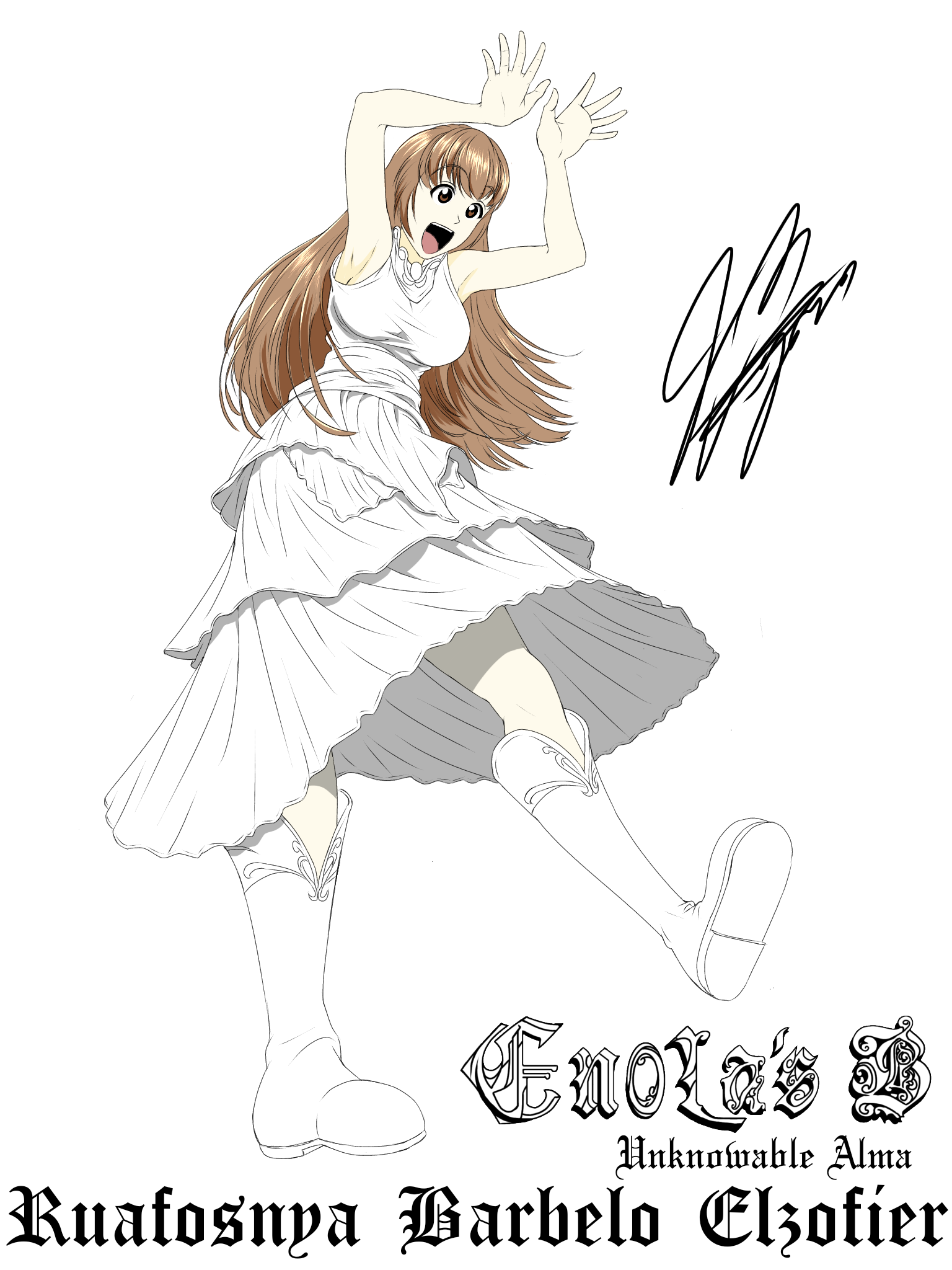 She carries the youthful appearance of a slim and average 18-year-old girl with none of the mature qualities of a woman. She has fair brown skin, brown eyes, and short brown hair worn in small twin pigtails. Her outfit is entirely white, consisting of a sleeveless white dress and white boots.